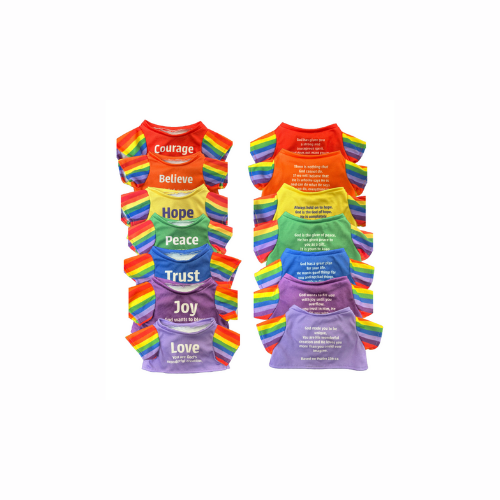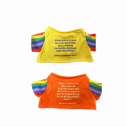 The initial range consists of seven, 40cm high, bespoke teddy bears each wearing a different coloured T shirt in the seven colours of the rainbow – God’s promise to His people. The T shirts are printed front and back with a verse based on scripture clearly printed on the reverse side. The T-shirts are removable and interchangeable and can be purchased separately to the bears.
